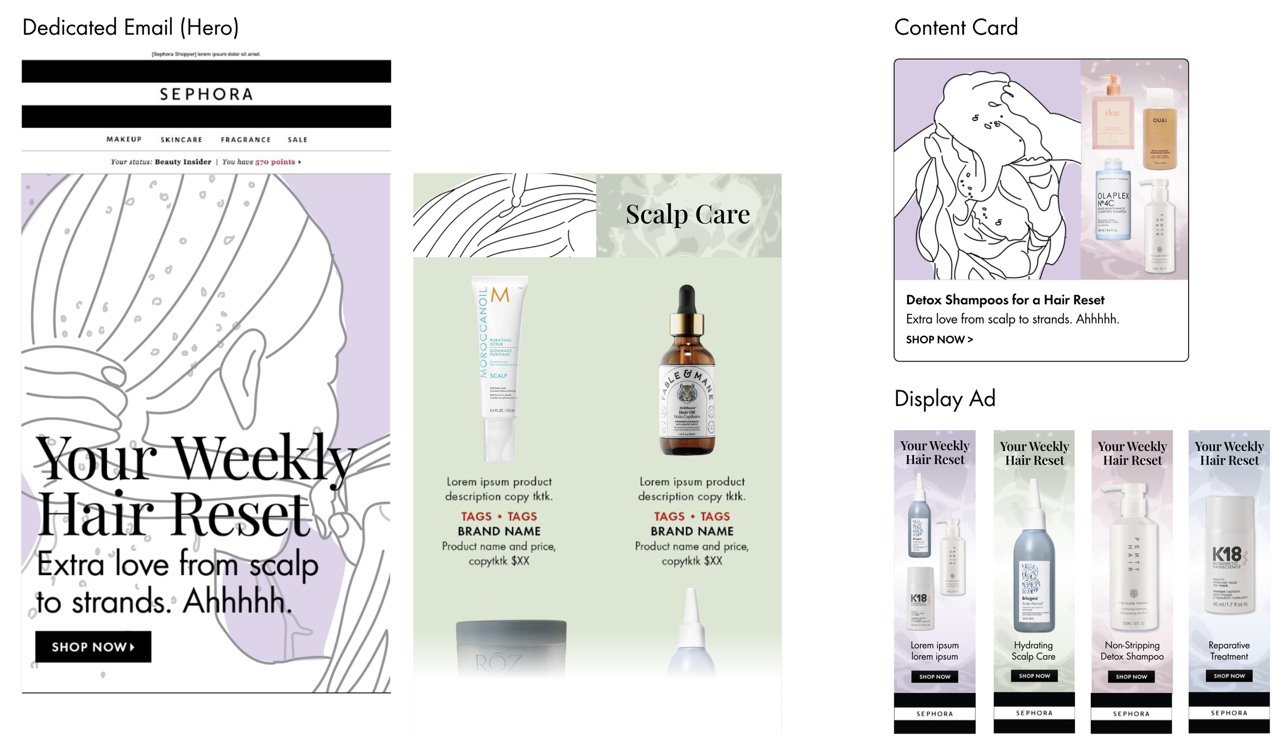 Hair-wash campaign featuring hot, new products at Sephora. Ask was to drive product sales and site traffic as well as illustrate options for an elevated shower routine. Creative concept demonstrated relaxation, tranquility, as well as a “pause” in one’s day. Paid social videos incorporated directions, stunning slow-motion visuals, and soothing sounds. Vibrant pastel colors delineated categories of Scalp Care, Detox Shampoos, and Masks.