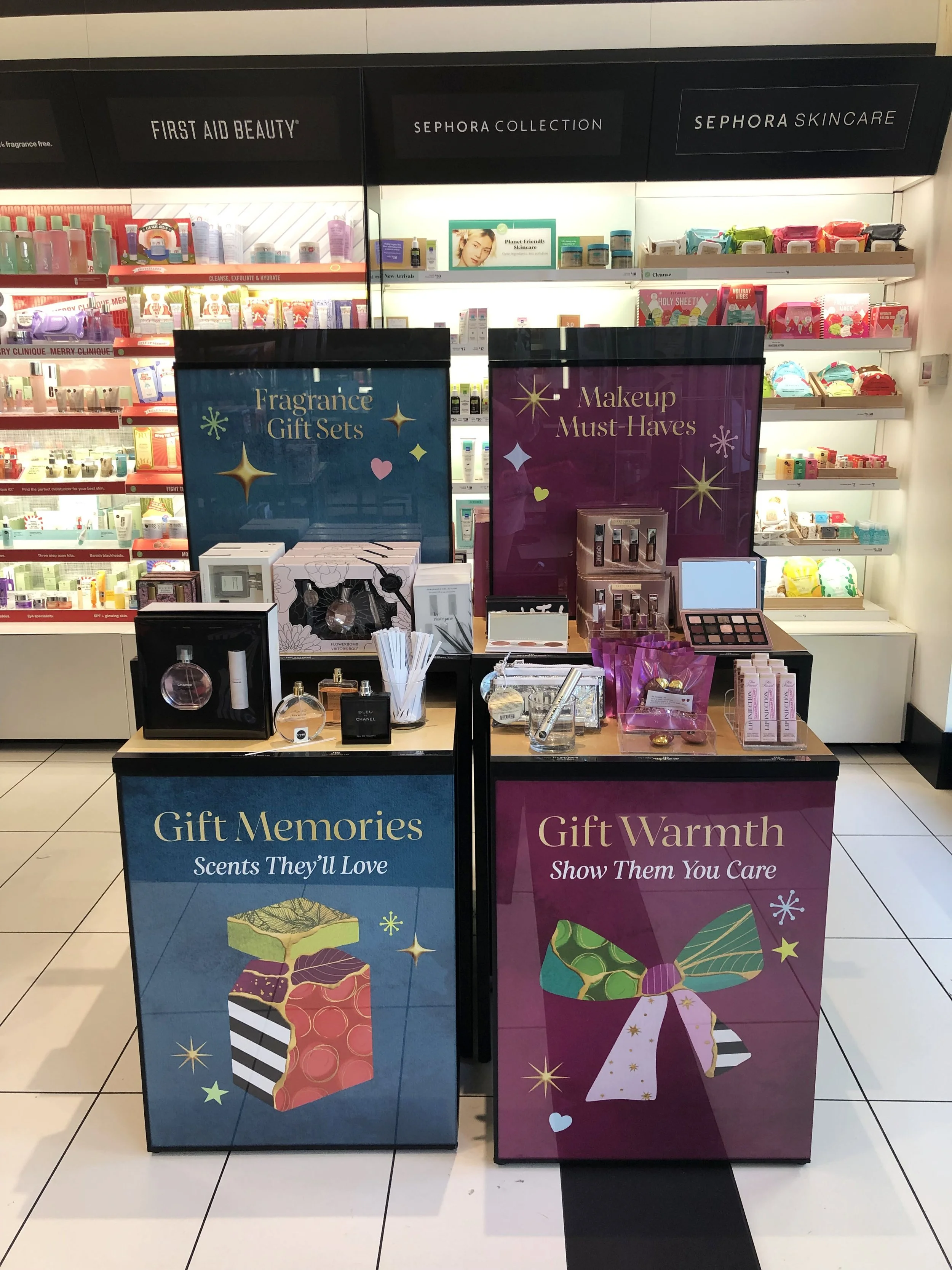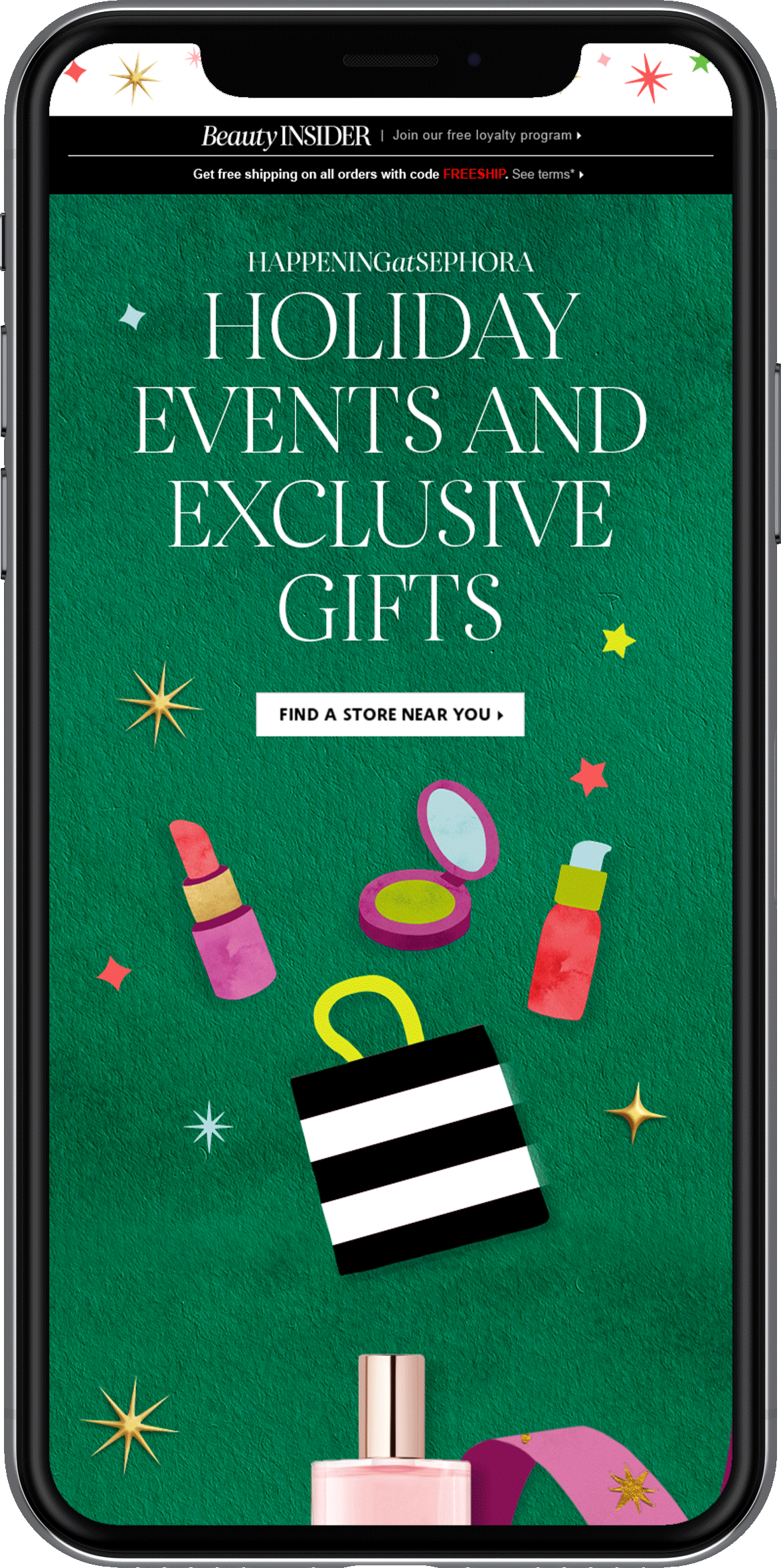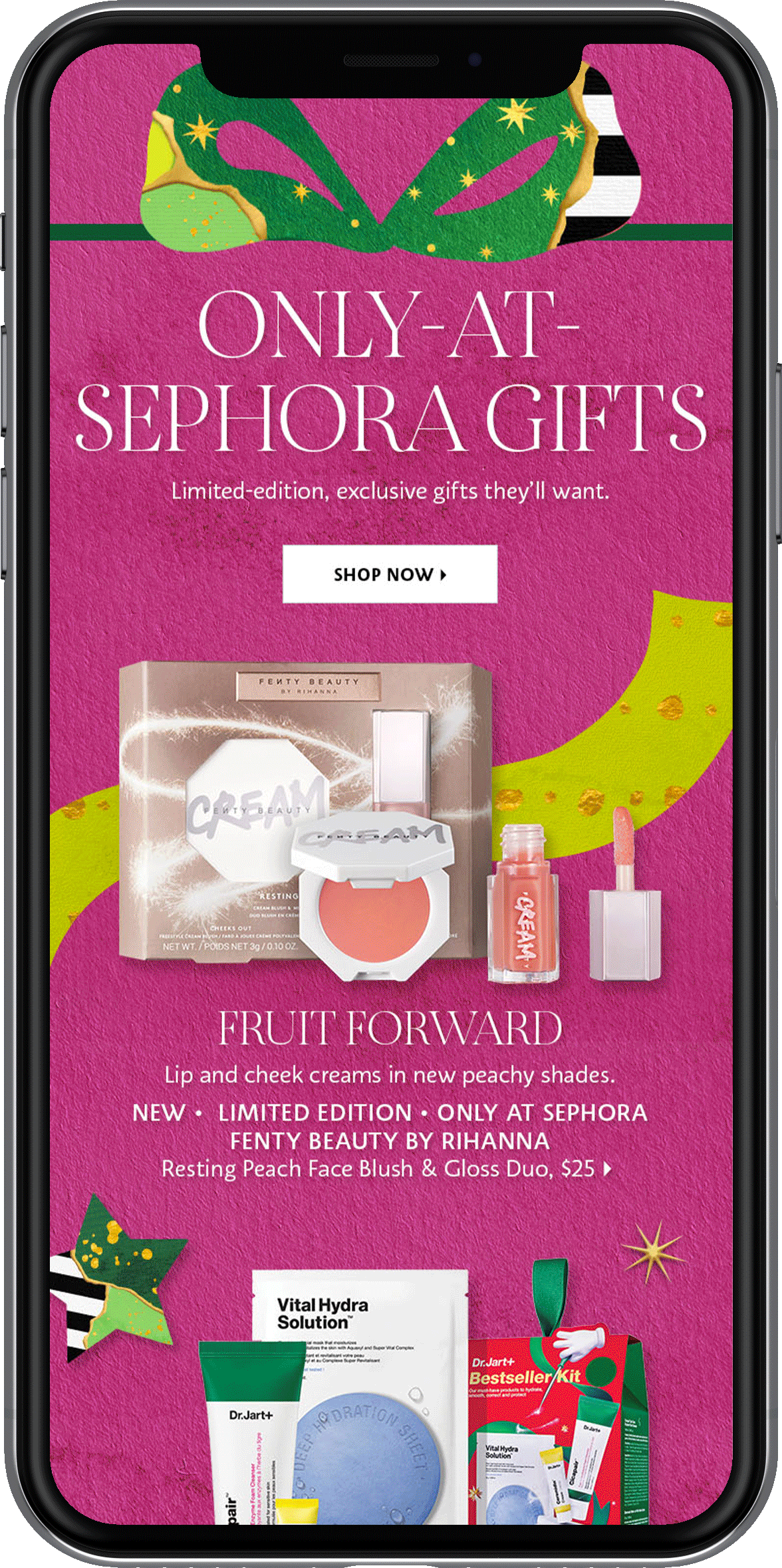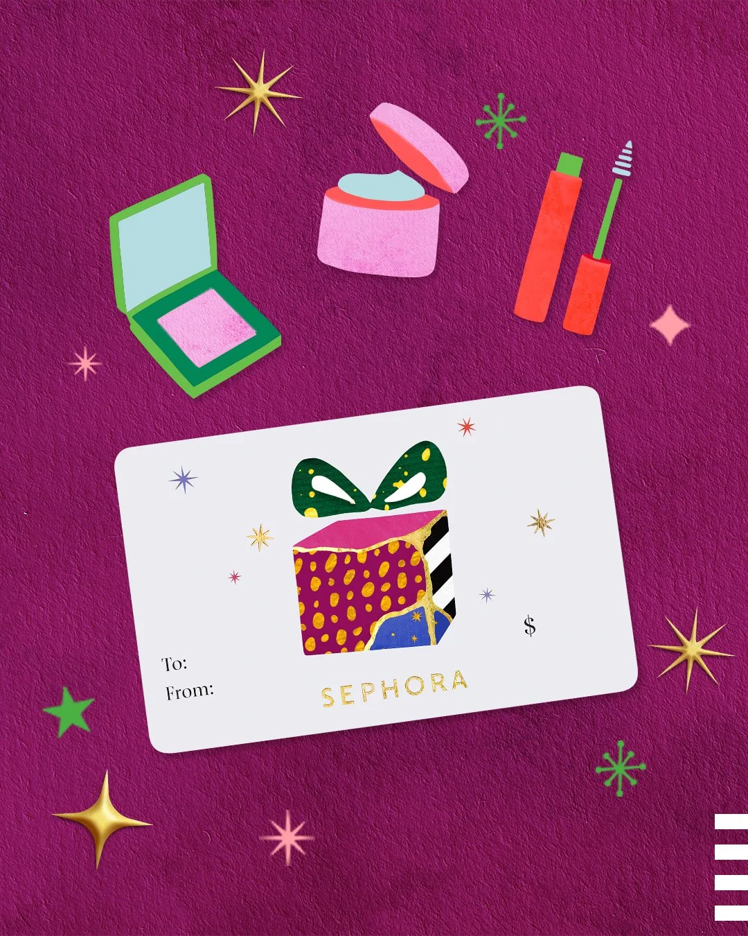 Holiday 360 campaign featuring holiday specific products (and more) at Sephora. Ask was to increase brand awareness, drive sales and site traffic as well as improve YOY results. Holiday was the largest campaign of the year encompassing all marketing channels throughout the business. Design systems were required to flex throughout multiple categories and assets including retail, digital, visual merchandising, etc. Creative concept was rooted in the idea that all of our broken parts can come together to create something beautiful. Graphics include artfully mended organic icons with textured layers to demonstrate approachability.